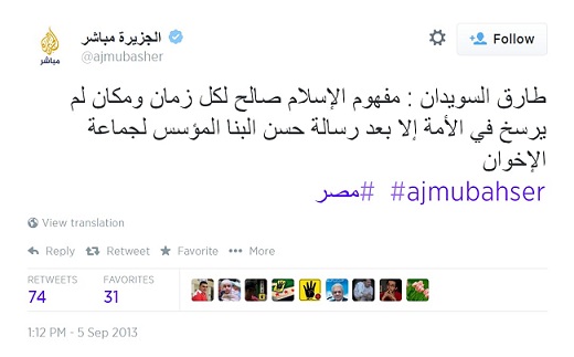 نشرت قناة الجزيرة الفضائية تغريدة بتاريخ 5/9/2013م، نقلت فيها كلام طارق سويدان جاء فيها: