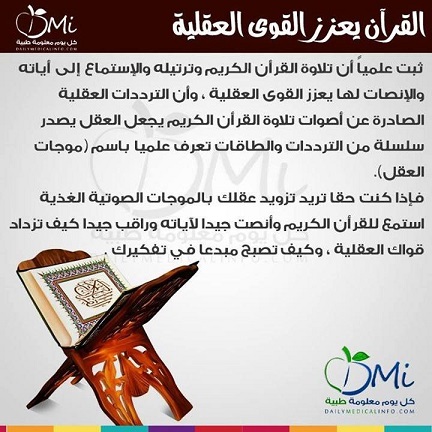 ثبت علميًا أن تلاوة القرآن الكريم وترتيله والاستماع إلى آياته والإنصات لها يعزز القوى العقلية، وأن الترددات العقلية الصادرة عن أصوات تلاوة القرآن الكريم يجعل العقل يصدر سلسلة من الترددات والطاقات تعرف علميًا باسم «موجات العقل» فإذا كنت حقًا تريد تزويد عقلك بالموجات الصوتية الغذية استمع للقرآن الكريم وأنصت جيدًا لآياته وراقب جيدًا كيف تزداد قواك العقلية، وكيف تصبح مبدعًا في تفكيرك.
